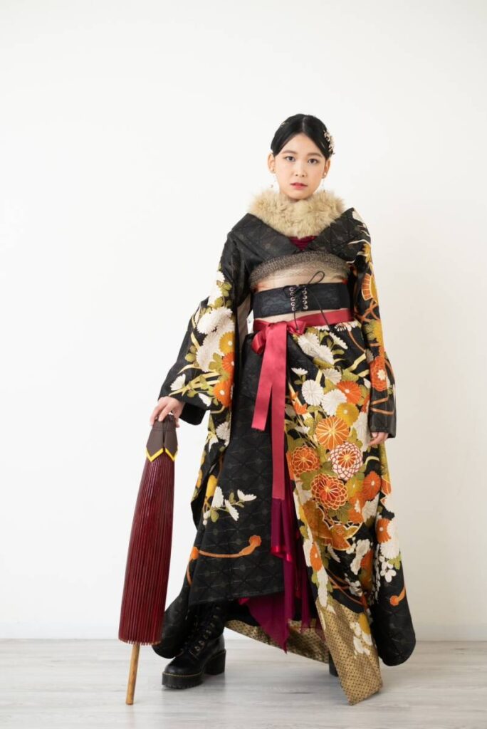 一枚の着物を切ったり縫ったりせずドレス風に形を作り着せてます。